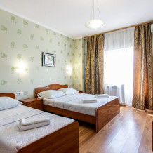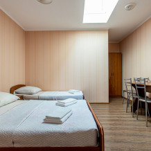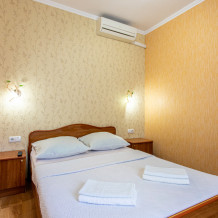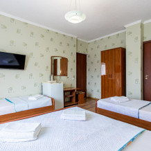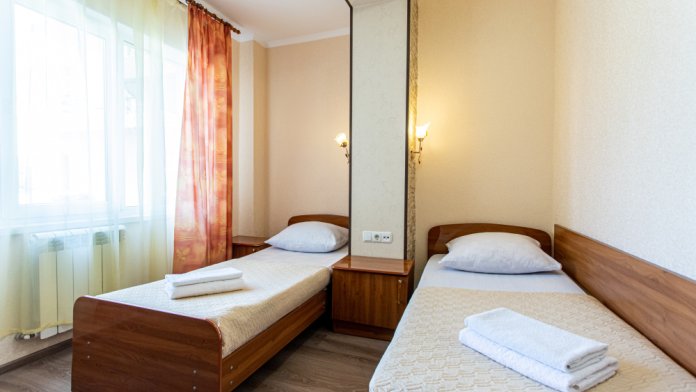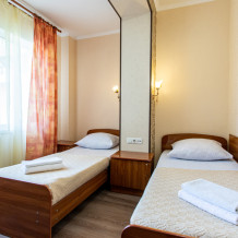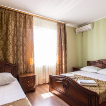 В номере две односпальные кровати, кресло-кровать, прикроватные тумбочки, стол, стулья, телевизор, холодильник, сплит-система, душ, с\у.