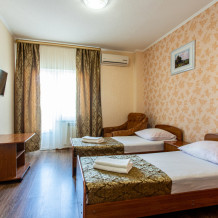 В номере двухкомнатном с балконом: двухспальная кровать, односпальная кровать, кресло-кровать. прикроватные тумбочки, стол, стулья, шкаф, сплит-система, телевизор, холодильник, душ, с/у.
