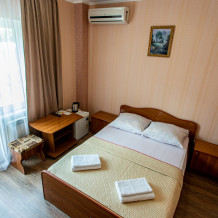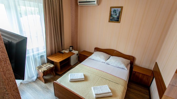 В номере шкаф, телевизор, холодильник, душ, с/у, сплит- система, прикроватные тумбочки, электрочайник, стол, стулья.