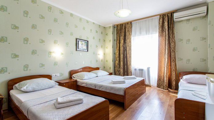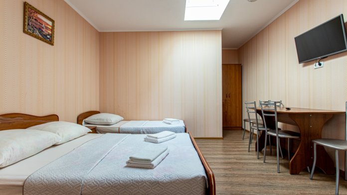 В номере двухспальная кровать, односпальная кровать, шкаф, стол, стулья, электрочайник, сплит-система, холодильник, телевизор, душ, с/у.