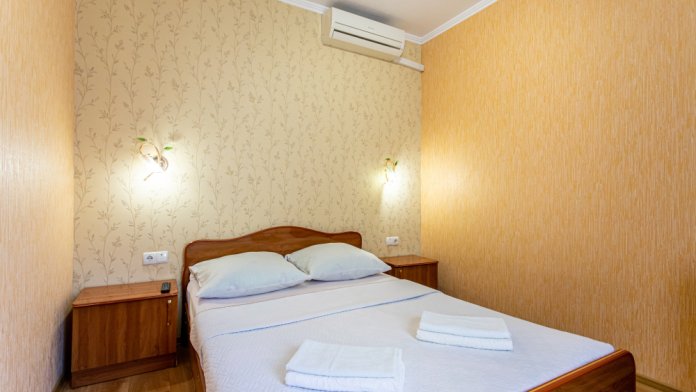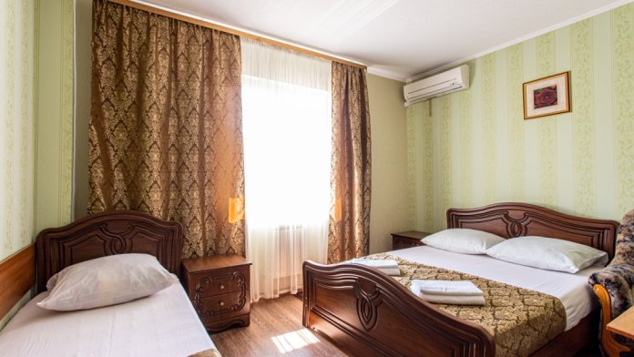 В двухкомнатном номере двухспальная кровать, односпальная кровать, кресло-кровать, прикроватные тумбочки, стол, стулья, телевизор, холодильник, сплит-система, шкаф, электрочайник, душ, с/у.