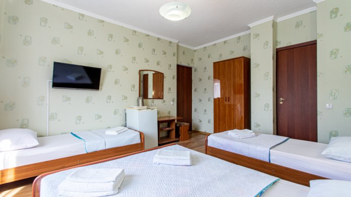 В двухкомнатном номере: двухспальные кровати, односпальные кровати, прикроватные тумбочки, стол, стулья, шкаф, телевизор, холодильник, сплит-система, электрочайник, душ, с\у.