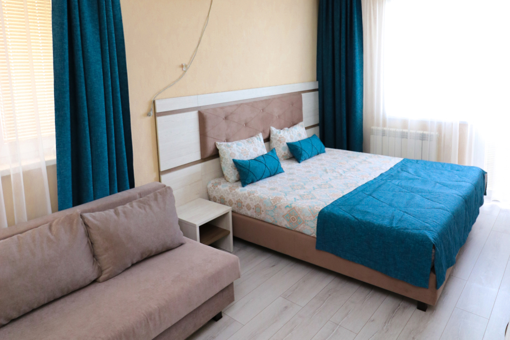 В Вашем распоряжении однокомнатные апартаменты с балконом и видом на море. В которых могут проживать до 4-х гостей. В номере ванная комната с душем, туалет, фен, полотенца, одноразовые средства личной гигиены, двуспальной кроватью с прикроватными тумбочками, диван-кровать, трюмо с зеркалом, постельное белье, телевизор с плоским экраном и кабельными каналами, шкаф, кондиционер, автономное отопление, wi-fi, мини-кухня(обеденный стол с табуретками, эл.чайник, микроволновая печь, холодильник, столовые приборы, эл.плита по требованию).