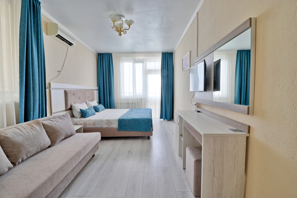 В Вашем распоряжении однокомнатные апартаменты с балконом и видом на море. В которых могут проживать до 3-х гостей. В номере ванная комната с душем, туалет, фен, одноразовые средства личной гигиены, двух спальная кровать, диван кровать, трюмо с зеркалом, пуфик, постельное белье, полотенца, широкоформатный телевизор с кабельными каналами, шкаф, кондиционер, автономное отоплением,