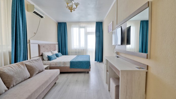 К Вашим услугам однокомнатные апартаменты с балконом и видом на море. В которых могут проживать до 3-х гостей. В номере ванная комната с душем, туалет, фен, одноразовые средства личной гигиены, двуспальной кроватью, диван-кроватью, журнальный столик, постельное белье, полотенца, широкоформатным телевизором с кабельными каналами, комод, зеркалом, шкаф, кондиционер, автономное отоплением, wi-fi, мини-кухня (стол, табуретки, эл.чайник, микроволновая-печь, холодильник, столовые приборы, эл.плита по требованию ).