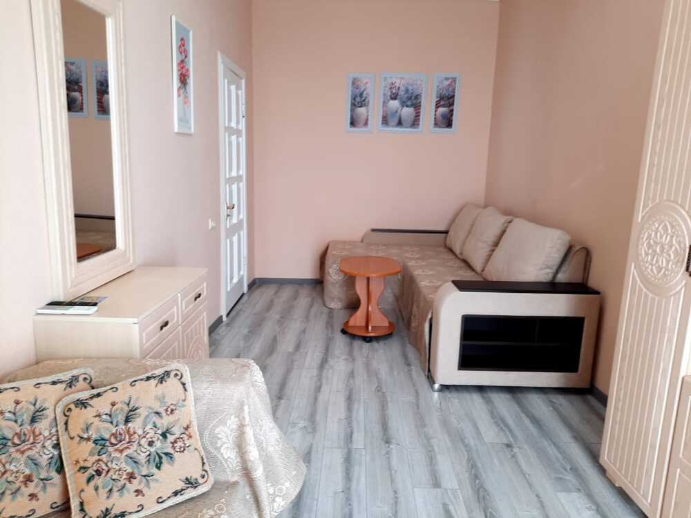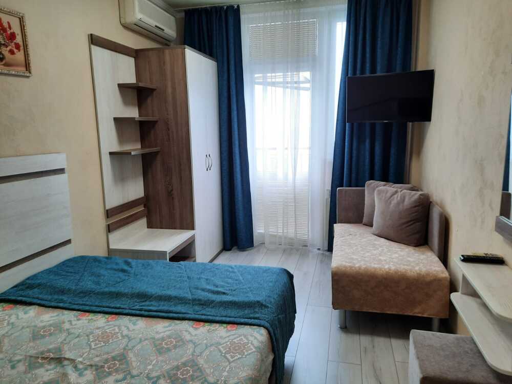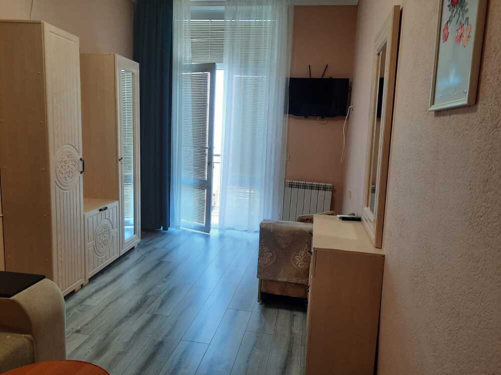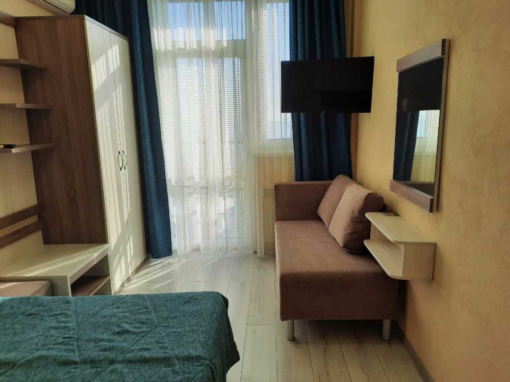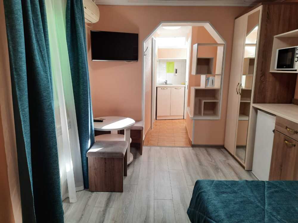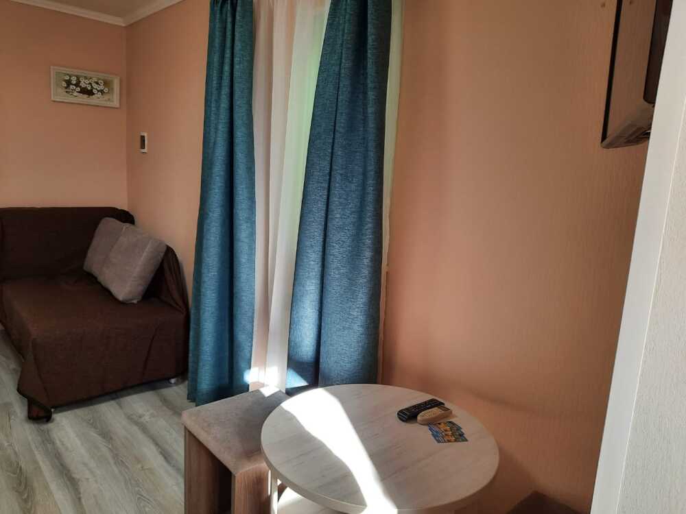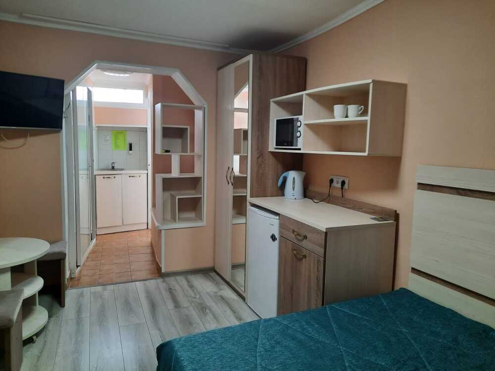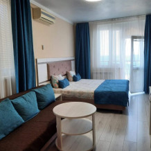 В Вашем распоряжении однокомнатные апартаменты с балконом и видом на море. В которых могут проживать до 3-х гостей. В номере ванная комната с душем, туалет, фен, двуспальной кроватью, диван-кроватью, журнальный столик, трюмо с зеркалом, постельное белье, полотенца, широкоформатным телевизором с кабельными каналами, шкаф, кондиционер, автономное отоплением, wi-fi, мини-кухня (стол с табуретками, эл.чайник, микроволновая-печь, холодильник, столовые приборы, эл.плита по требованию).