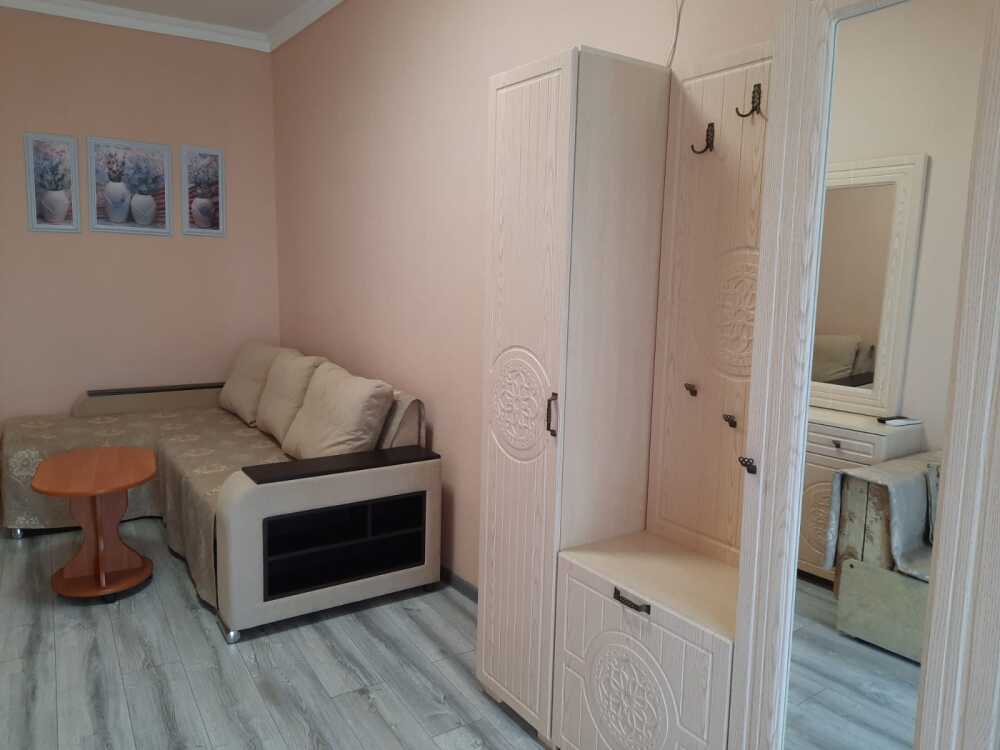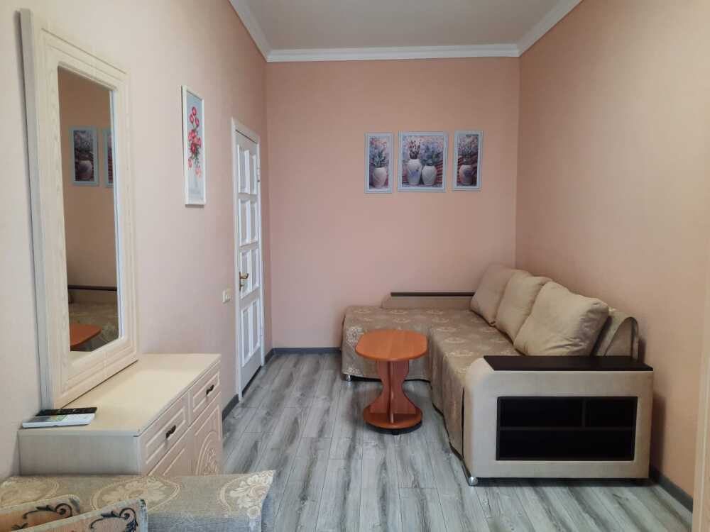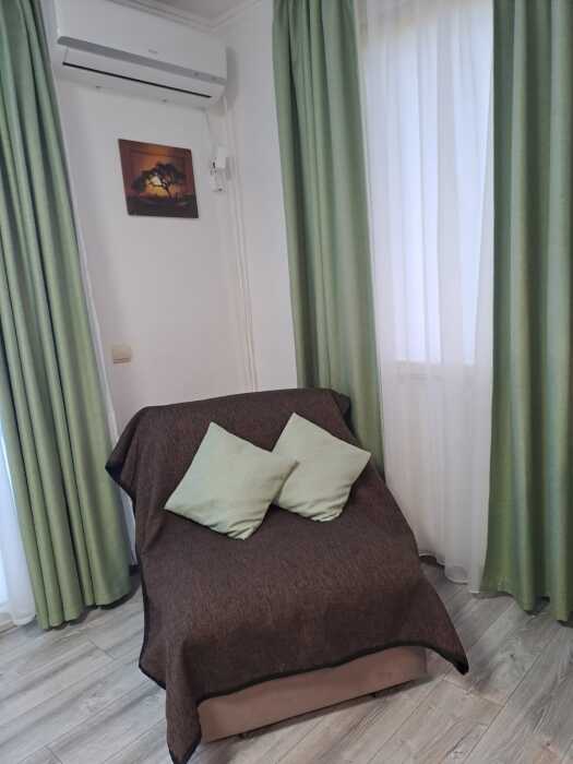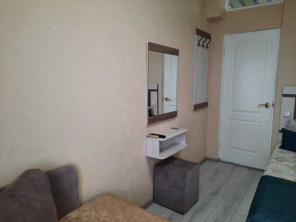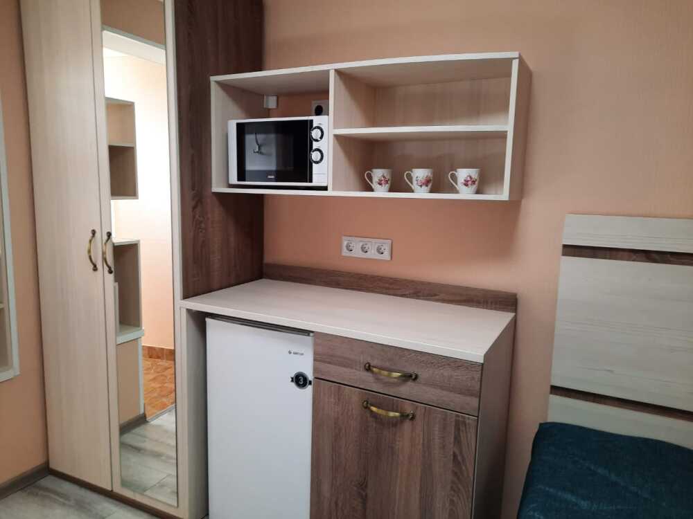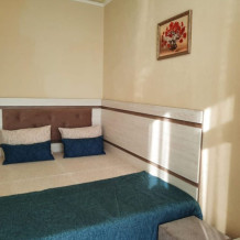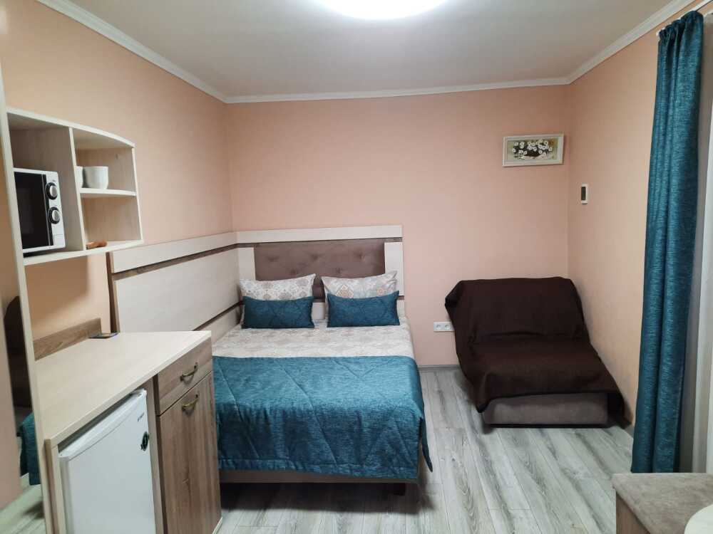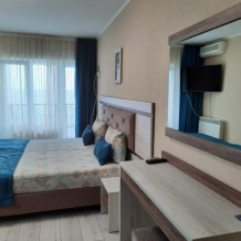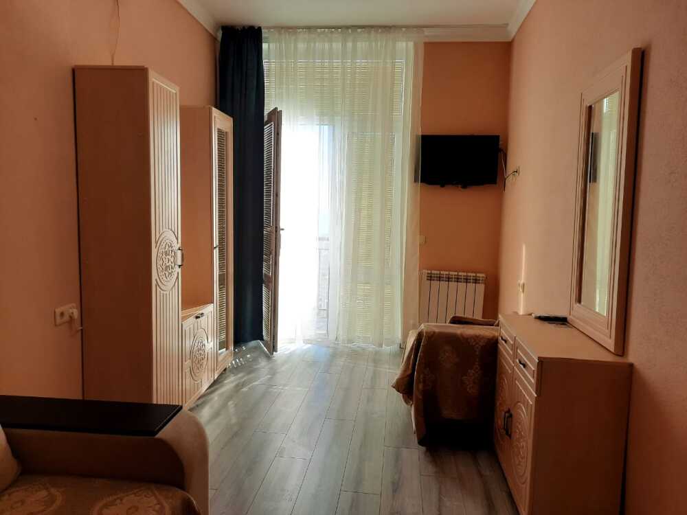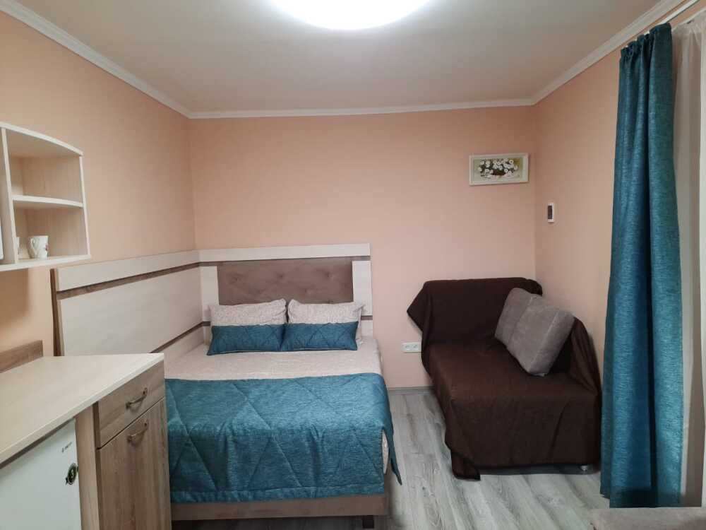 В Вашем распоряжении однокомнатные апартаменты с балконом и видом на море. В которых могут проживать до 3-х гостей. В номере ванная комната с душем, туалет, фен, двуспальной кроватью, диван-кроватью, журнальный столик, трюмо с зеркалом, постельное белье, полотенца, широкоформатным телевизором с кабельными каналами, шкаф, кондиционер, автономное отоплением, wi-fi, мини-кухня (стол с табуретками, эл.чайник, микроволновая-печь, холодильник, столовые приборы, эл.плита по требованию).