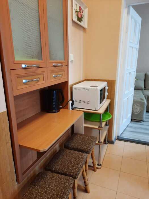 wi-fi, микроволновая-печь, эл.чайник, холодильник, столовые приборы, эл.плита, обеденный стол с табуреткам.