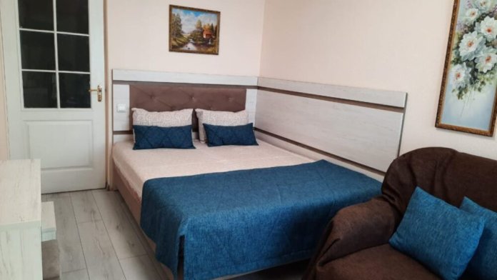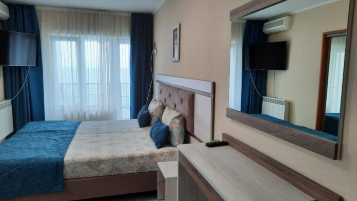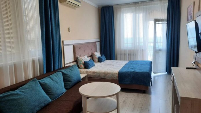 В Вашем распоряжении однокомнатные апартаменты с балконом и видом на море. В которых могут проживать до 4-х гостей. В номере ванная комната с душем, туалет, фен, полотенца, одноразовые средства личной гигиены, двуспальной кроватью с прикроватными тумбочками, диван-кровать, трюмо с зеркалом, постельное белье, телевизор с плоским экраном и кабельными каналами, шкаф, кондиционер, автономное отопление, wi-fi, мини-кухня(обеденный стол с табуретками, эл.чайник, микроволновая печь, холодильник, столовые приборы, эл.плита по требованию).