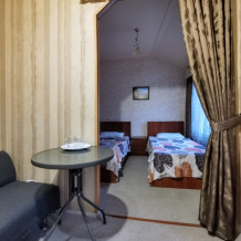 Оснащение номеров: Сплит-система, отопление, мини-холодильник, жк - телевизор, кабельное тв, журнальный столик, пуфик, шкаф для одежды, тумбочки, зеркало.