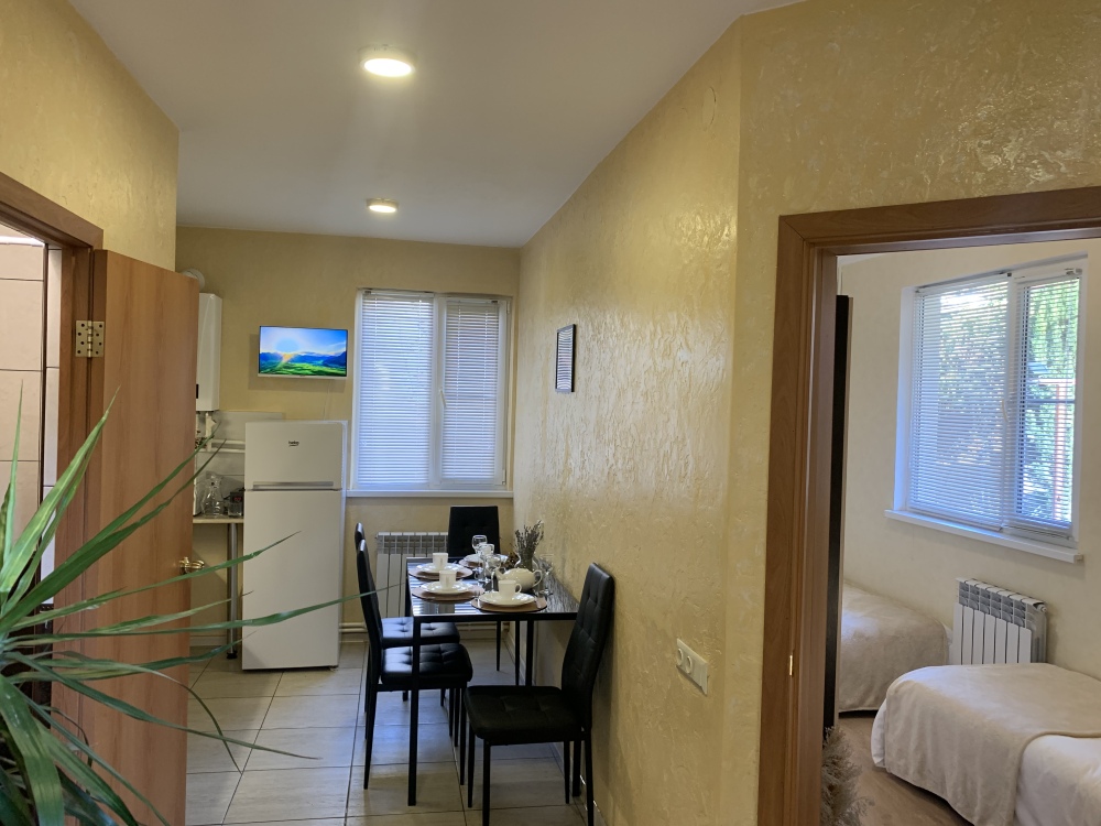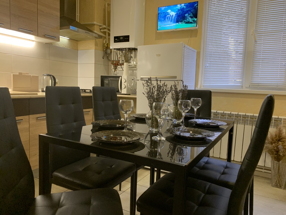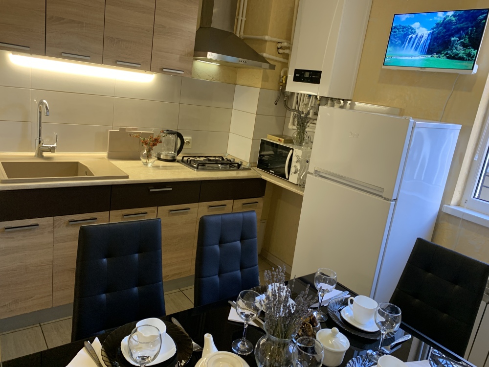 - На кухне полный набор посуды, газовая плита, микроволновка, холодильник, телевизор, обеденная группа.