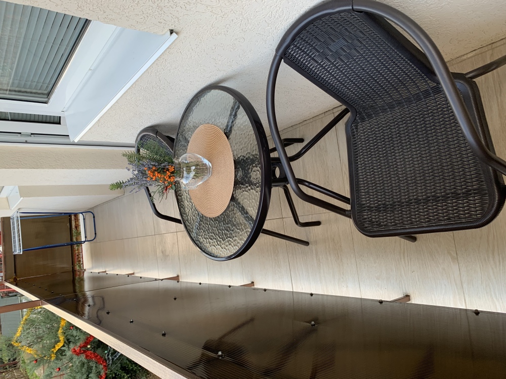 - На балконе стол с креслами для отдыха и сушилка для белья, бельевые тросы во дворе
