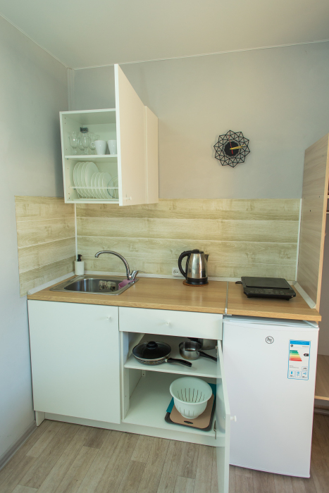 В домике есть кухня, оборудована полностью- эл. плитка, чайник, посуда для приготовления еды и приема пищи, раковина, моющие средства, холодильник