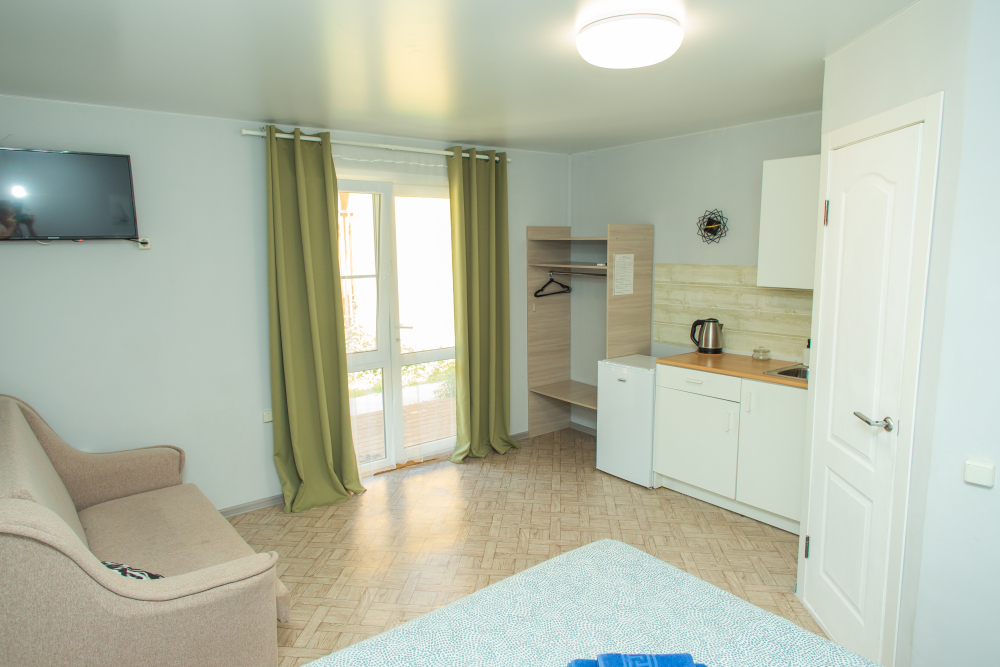 Первая комната-гостиная, в ней находятся кухня, две односпальные кровати, 2х спальный диван, ТВ.