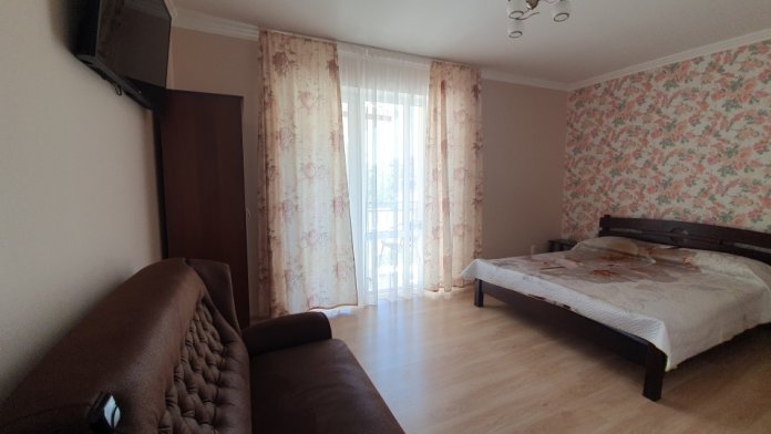 Это уютные современные номера, оборудованные кухней и всем необходимым для комфортного проживания. С балконов коттеджа открывается живописный вид на море. Сидя вечером на балконе за бутылочкой хорошего крымского вина, наблюдая всю прелесть окружающей природы, вы почувствуете незабываемую атмосферу отдыха. Территория гостевого дома невелика, но уют и чистота всегда привлекает гостей на отдыхе. На территории расположены беседка для первого этажа, мангал для любителей шашлыка, много зеленой растительности, радующей глаз.