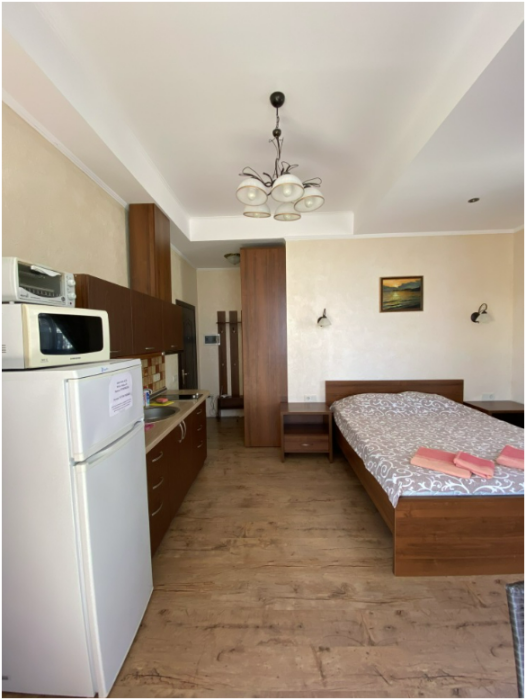 Апартамент-студио с прямым видом на море на 6-м этаже. Кухонная зона оборудована всем необходимым. Бронирование от 2 ночей.