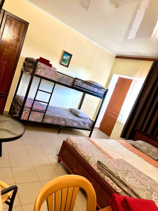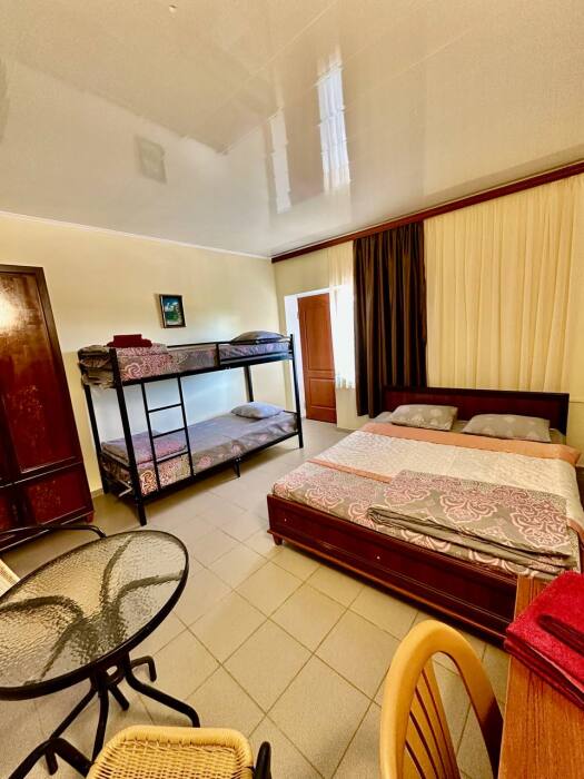 Уютный семейный номер, рассчитан на размещение 4 гостей. В номере есть все необходимое для комфортного проживания: удобная двуспальная кровать и двухярусная кровать, прикроватные тумбочки, шкаф для одежды, туалетный столик, С/У с душем.