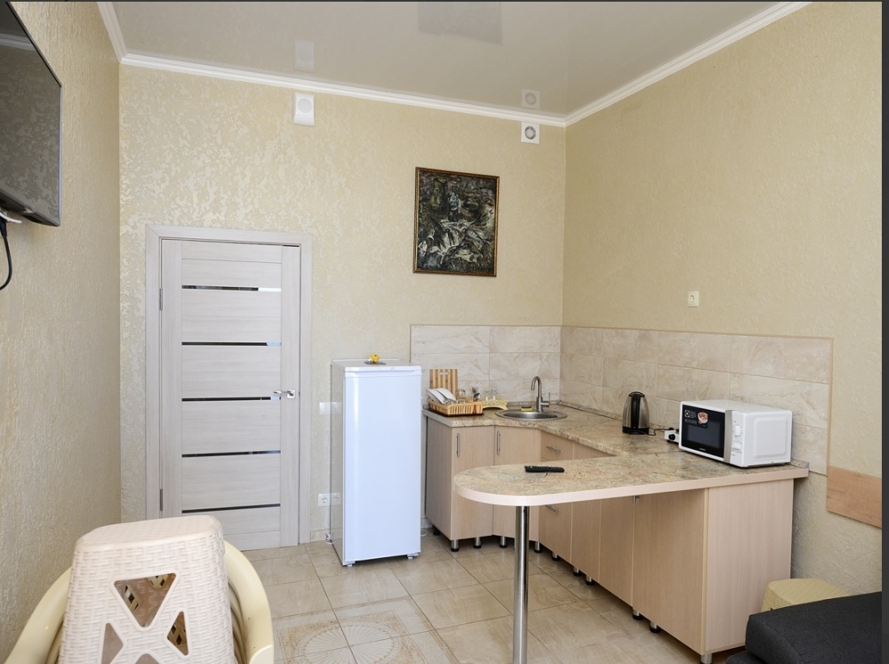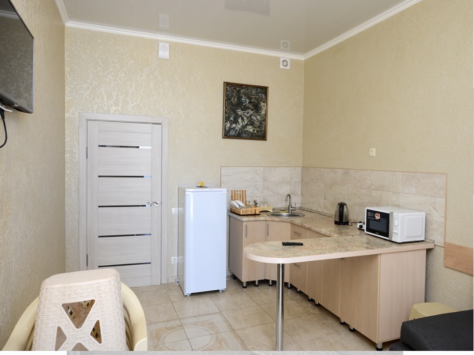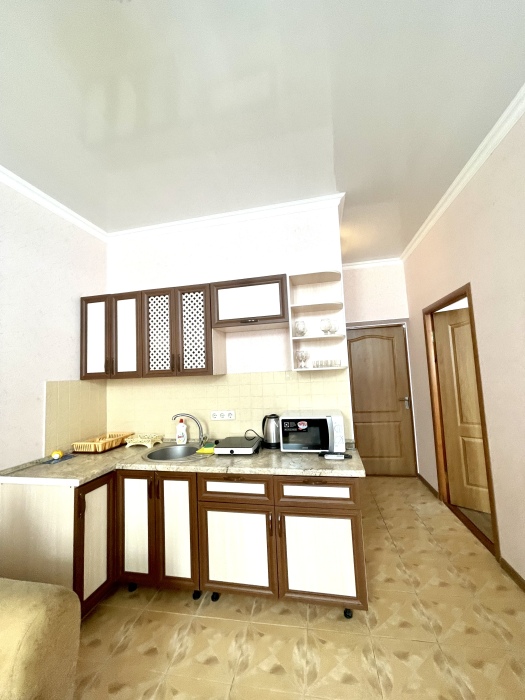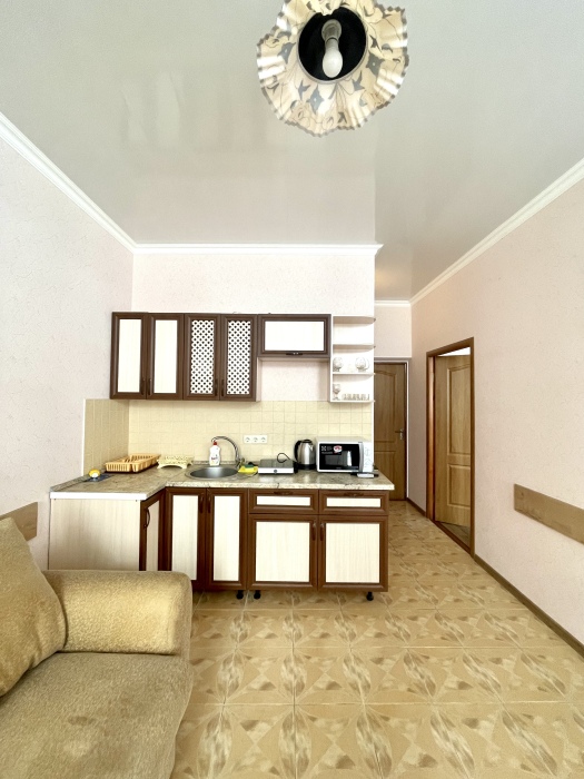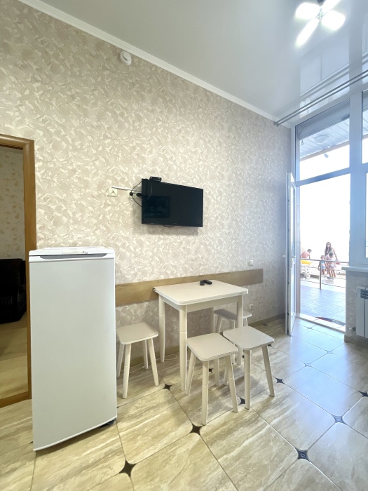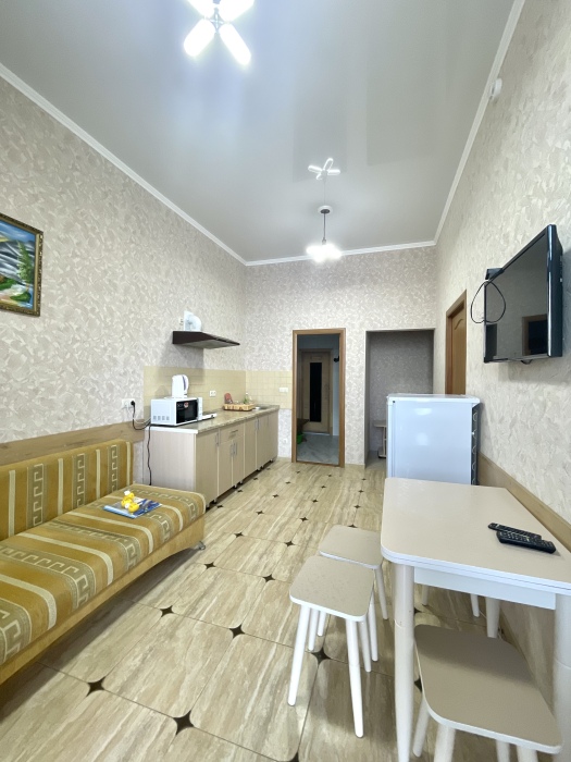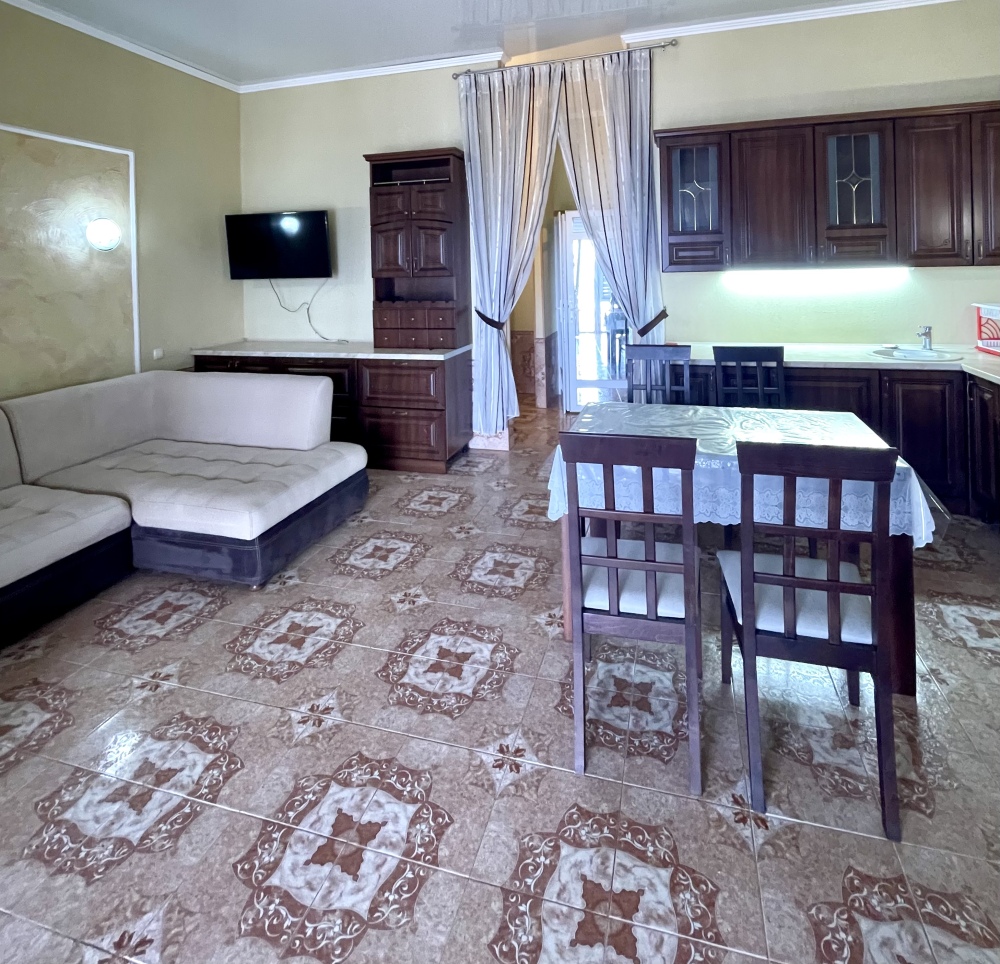 Элегантный номер 2-комнатный с кухней. Комнаты оснащены телевизорами с плоским экраном и спутниковыми каналами, кондиционерами. Номер с выходом на пляж, у номера стол и стулья для отдыха. Номер 2-комнатный, в одной комнате двуспальная кровать, другая комната совмещена с кухонной зоной в которой, из мебели двухспальный диван и прикроватный столик. Предоставляются постельные принадлежности, полотенца, вся необходимая посуда, холодильник , электрический чайник, микроволновая печь, индукционная плита.