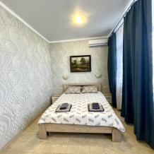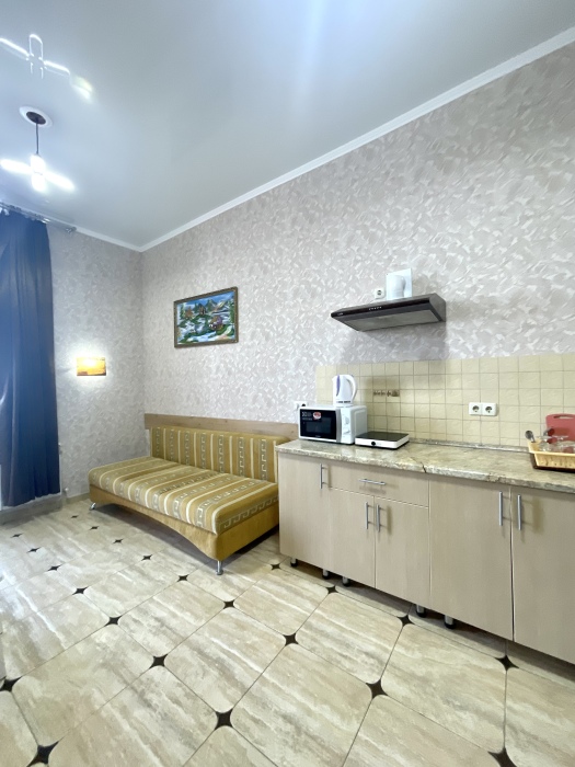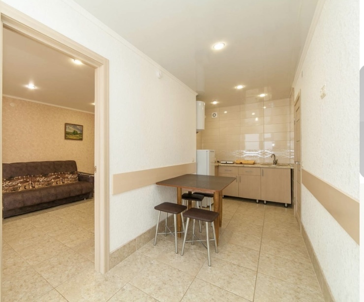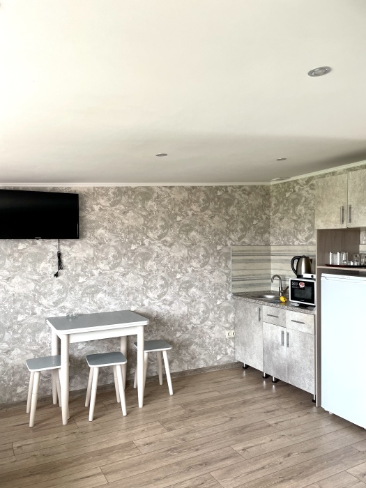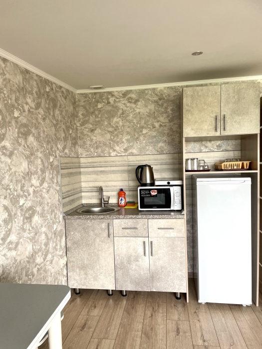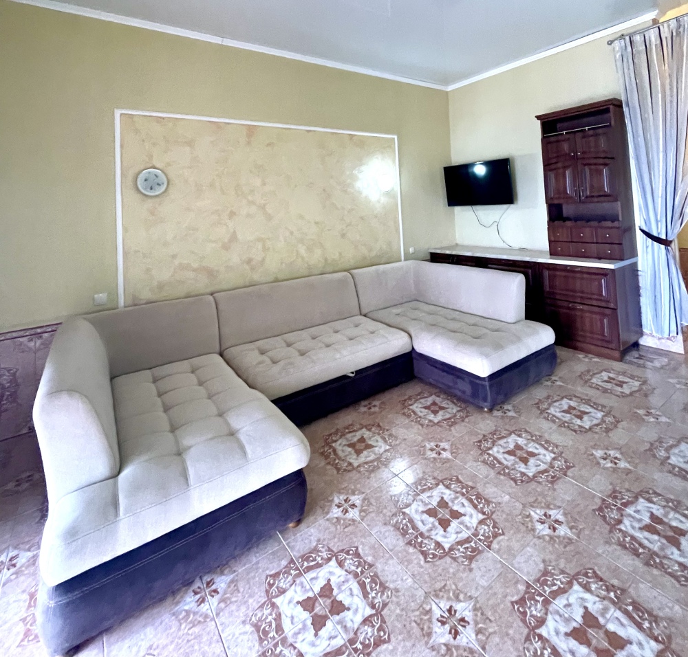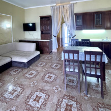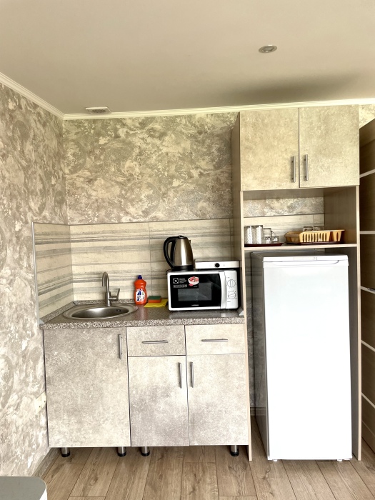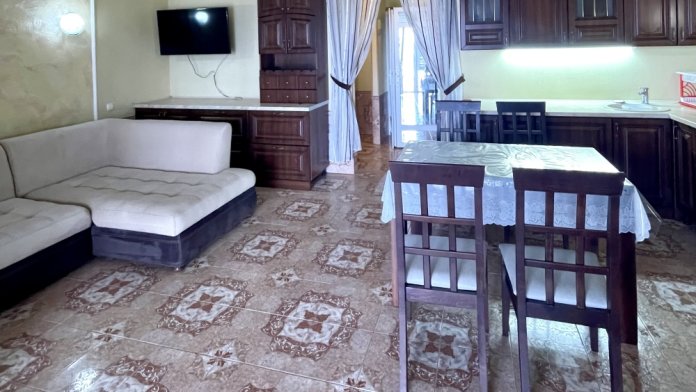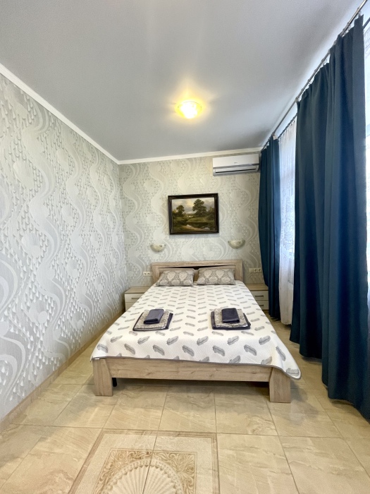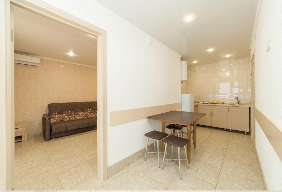 Элегантный номер 2-комнатный с кухней. Комнаты оснащены телевизорами с плоским экраном и спутниковыми каналами, кондиционерами. Номер с выходом на пляж, у номера стол и стулья для отдыха. Номер 2-комнатный, в одной комнате двуспальная кровать, другая комната совмещена с кухонной зоной в которой, из мебели двухспальный диван и прикроватный столик. Предоставляются постельные принадлежности, полотенца, вся необходимая посуда, холодильник , электрический чайник, микроволновая печь, индукционная плита.