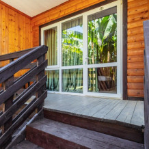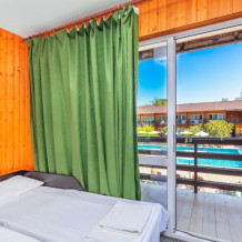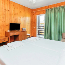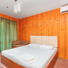 - комфортабельный однокомнатный номер с балконом с отдельным входом ( 1 этаж) со всеми удобствами, оборудован одной двуспальной кроватью, кресло-кровать, шкаф, стол, стул, душевая