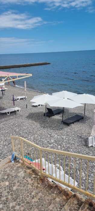 Комплекс находится на первой линии от моря, с 2 большими галечными картами пляжа, оснащенными шезлонгами, охраной и спасателями.