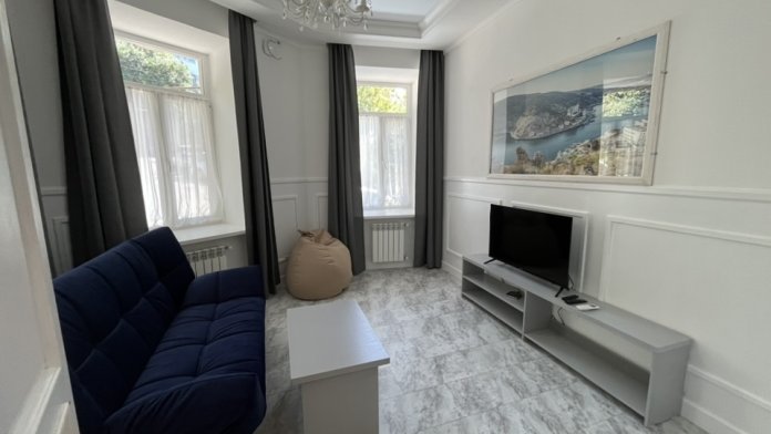 Комната с раскладывающимся диваном, телевизором, кондиционером. Спальня с двумя кроватями. Кухня с плитой, микроволновкой, посудомойкой, холодильником и посудой.