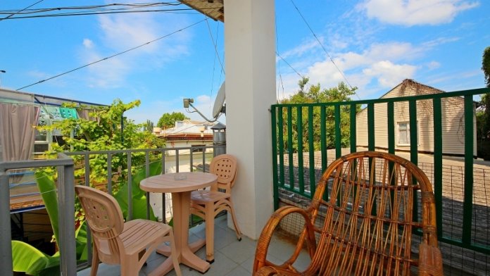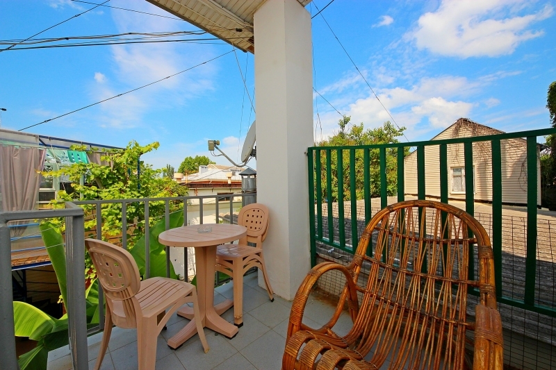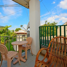 Трехместная комната с удобствами с балконом и террасой на втором этаже: санузел, душ, Wi-Fi, холодильник, сейф, TV, фен и кондиционер, площадь 15 м2. В комнате двуспальная кровать и односпальная кровать, шкаф, тумбочка, столик, холодильник, стулья, зеркало, собственный обеденный стол на террасе и кресло-качалка.