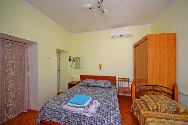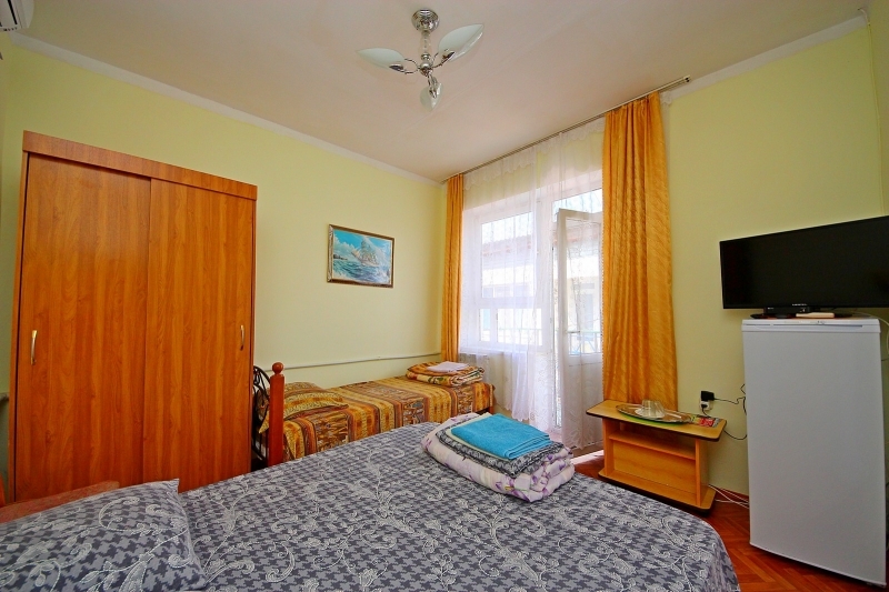 Трехместная комната с удобствами на первом этаже: душ, санузел, Wi-Fi, холодильник, сейф, TV, фен и кондиционер, площадь 15 м2. В комнате двуспальная кровать, раскладной диван, шкаф, столик, стул, зеркало, собственный обеденный столик во дворе.