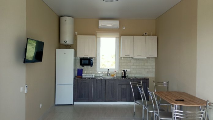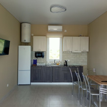 Идеальное место для семейного отдыха с детьми. Шесть одинаковых трёхкомнатных таунхаусов, в каждом из которых две спальни, каждая с собственным санузлом. Между спальнями расположена кухня-гостиная. В каждой из трёх комнат есть кондиционер. В гостиной установлен смарт-ТВ, а на кухне – плита и большой холодильник. Перед каждым таунхаусом есть мангал, но нет полноценного столика. Немного не хватает стиральной машины и столов со скамейками в мангальной зоне. До моря всего 300 метров, и даже переноска сапов не утомляет. Сервис ненавязчивый, по-абхазски, но при общении все решается легко. Пляж огромный и пустынный. Рядом есть ещё одна гостиница с рестораном, где можно питаться.
