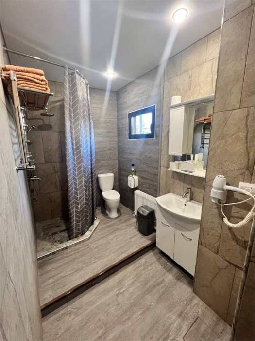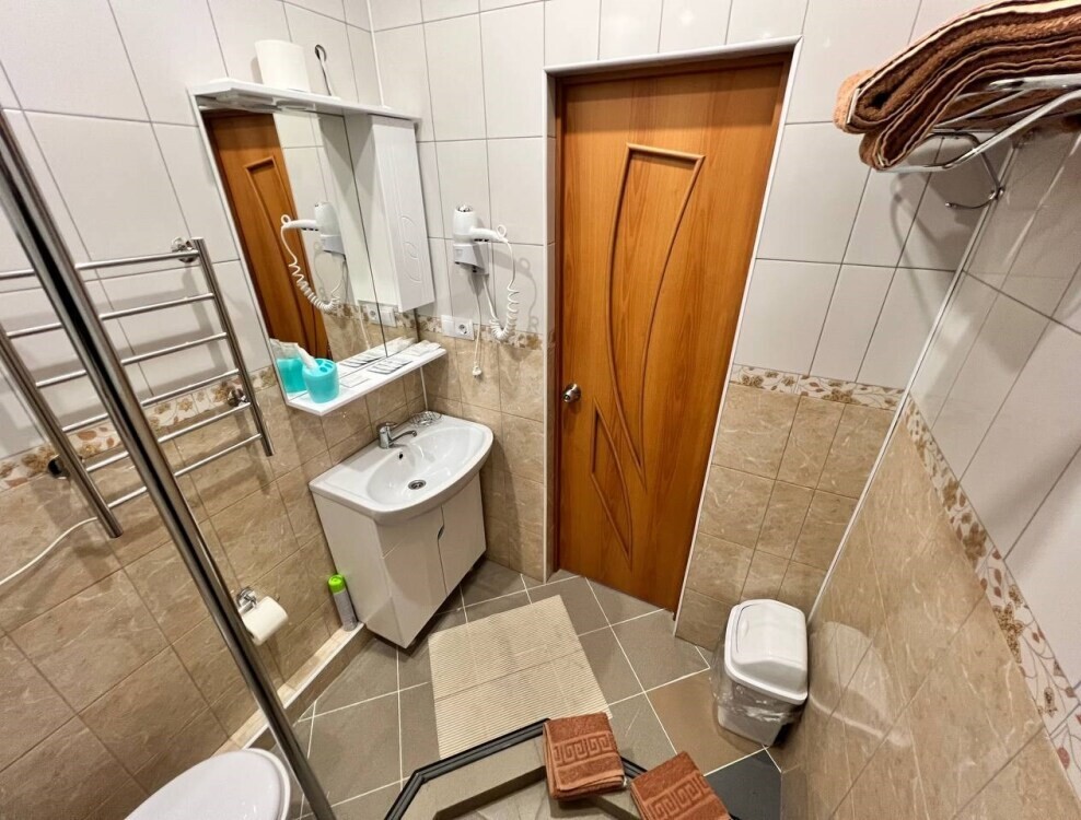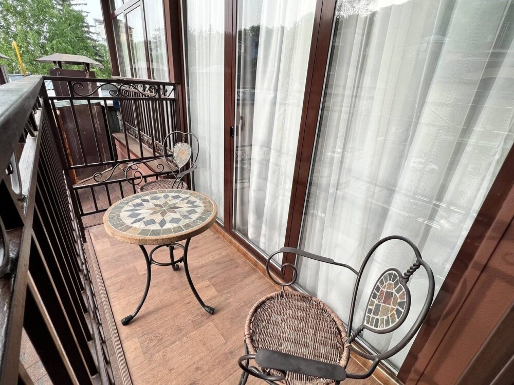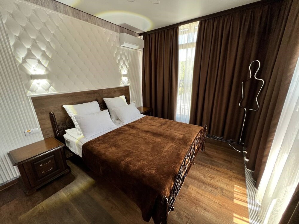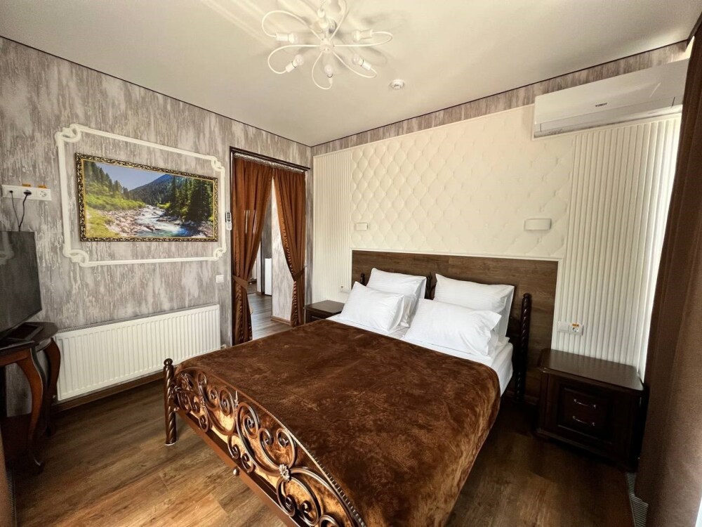 Совмещенный санузел с душевой, фен, гигиенические средства, косметические средства, полотенца, халат, тапочки; сушилка для белья. Двухкомнатный номер. В номере гостиная (1 комната) и спальня (2 комната); двуспальная кровать (DBL), ортопедический матрас, мягкая мебель, ТВ, мини-холодильник, КД, сейф, Wi-Fi, чайник, чашки, чай и кофе, питьевая вода. Балкон с видом на горы и город. Доп. место – диван.