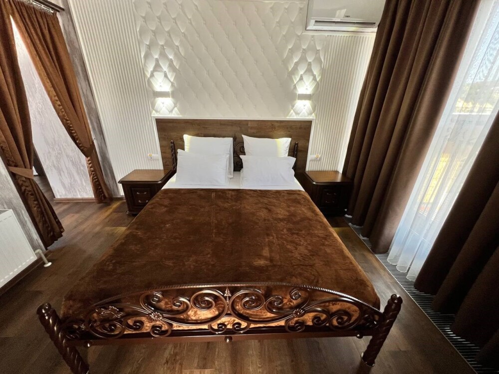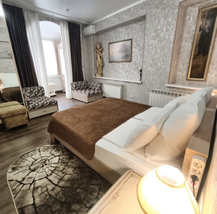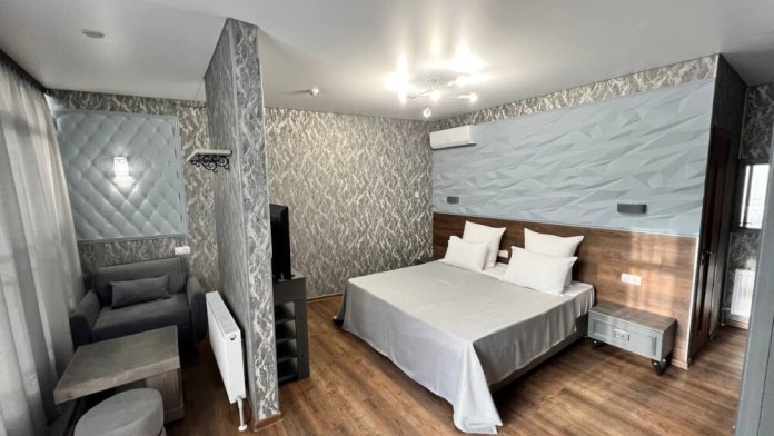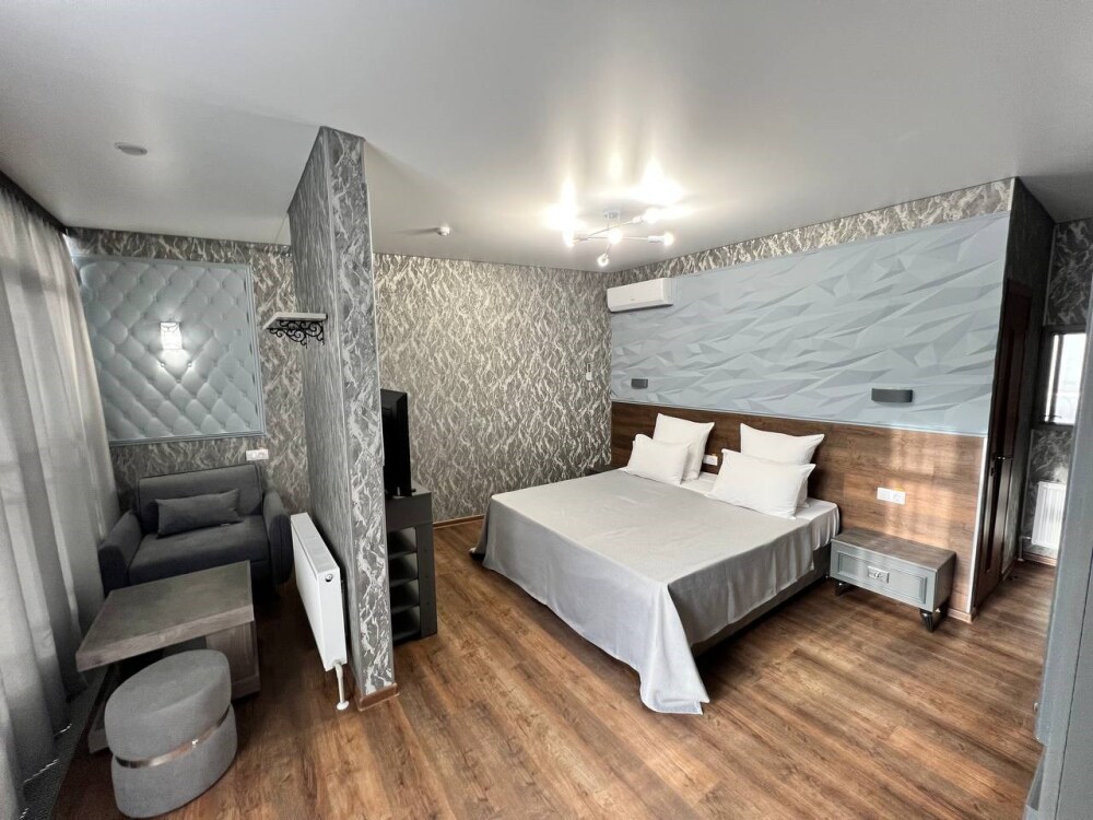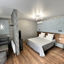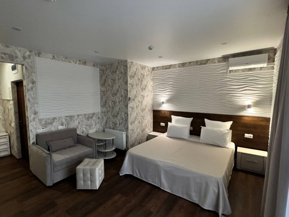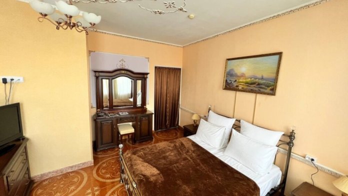 В номере кровати системы «спринг-бокс» - трансформируются в отдельные кровати. Так же: ортопедический матрас, мягкая мебель, ТВ, мини-холодильник, сейф, телефон, Wi-Fi, чайник, чашки, чай и кофе, питьевая вода. Балкон с видом на город. Совмещенный санузел с ванной, фен, гигиенические средства, косметические средства, полотенца, халат, тапочки, сушилка для белья.