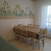 Кухня с газовой плитой, вытяжкой, холодильником, микроволновкой. В номере есть основная необходимая кухонная и столовая посуда, стекло и приборы на двоих. Обеденный стол и стулья.