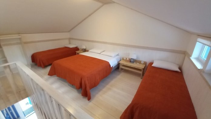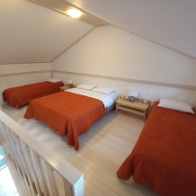 На первом этаже: санузел, выход на балкон, мини-кухня, диван-кровать (раскладывается). На втором этаже: двухспальная кровать и две односпальные.
