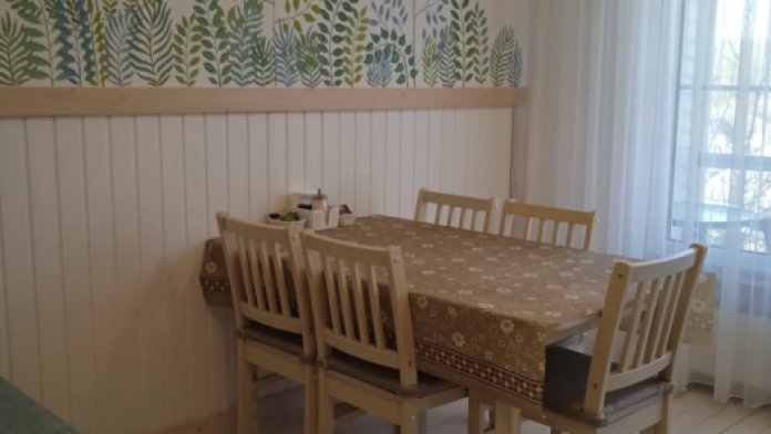Новый отдельностоящий домик из блоков, утеплённый и оштукатуренный. Внутри - один объём (студия), то есть, все гости ночуют в одном помещении. Много окон.