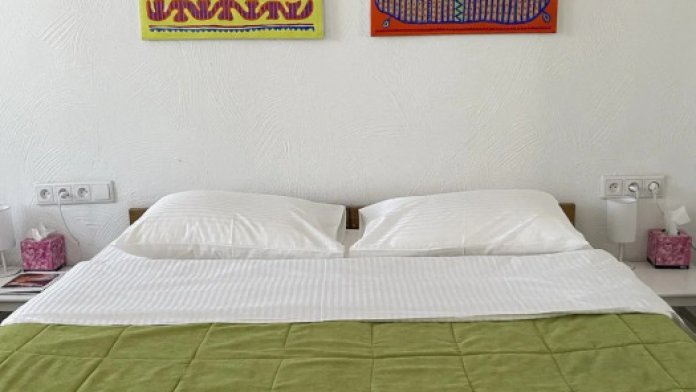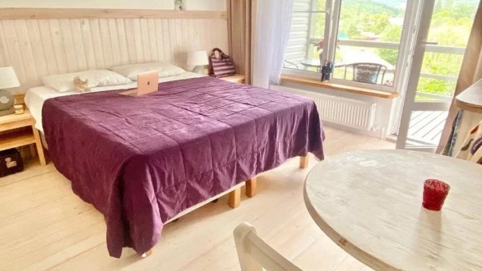 Студия в таунхаусе на двоих с видовой верандой и кухней и всеми удобствами. Можно сделать две отдельные кровати по запросу. Новые матрасы, одеяла, подушки, постельное белье и полотенца. Одноразовые тапочки.