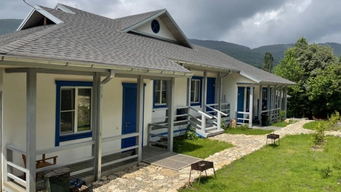 Каменистый путь в сторону плато начинается прямо за воротами. Белые домики с яркими синими наличниками гармонируют с традиционной южно-русской застройкой, отделка диким камнем напоминает о близости гор.