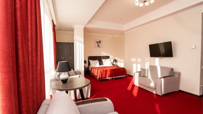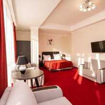 Номер делится на 2 половины: гостиная с мягким гарнитуром из дивана и двух кресел, спальня с широкой двуспальной кроватью.
