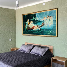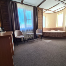 В номере, просторная прихожая с вешалкой. Одна двуспальная кровать, прикроватные тумбы, журнальный столик, диван, стулья.
