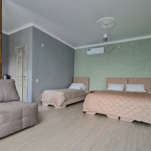 В номере, просторная прихожая с вешалкой. Одна двуспальная кровать, одна односпальная, прикроватные тумбы и светильники, журнальный столик, диван, стулья.