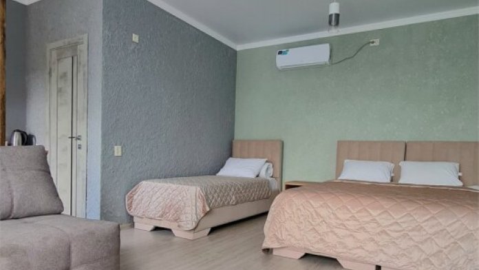 - две односпальные кровати 80*200, холодильник, телевизор, стол, шкаф или комод, чайник, кружки, (2-3 этаж кондиционер сплит-система) ванная комната.