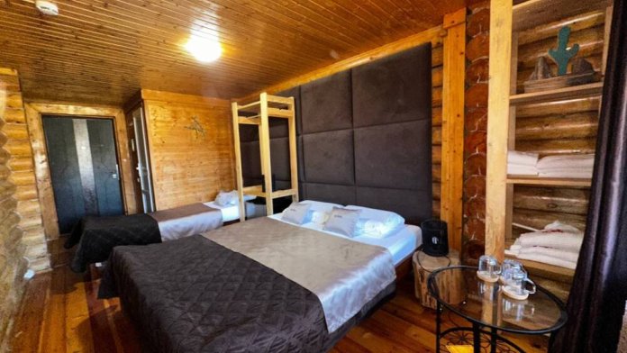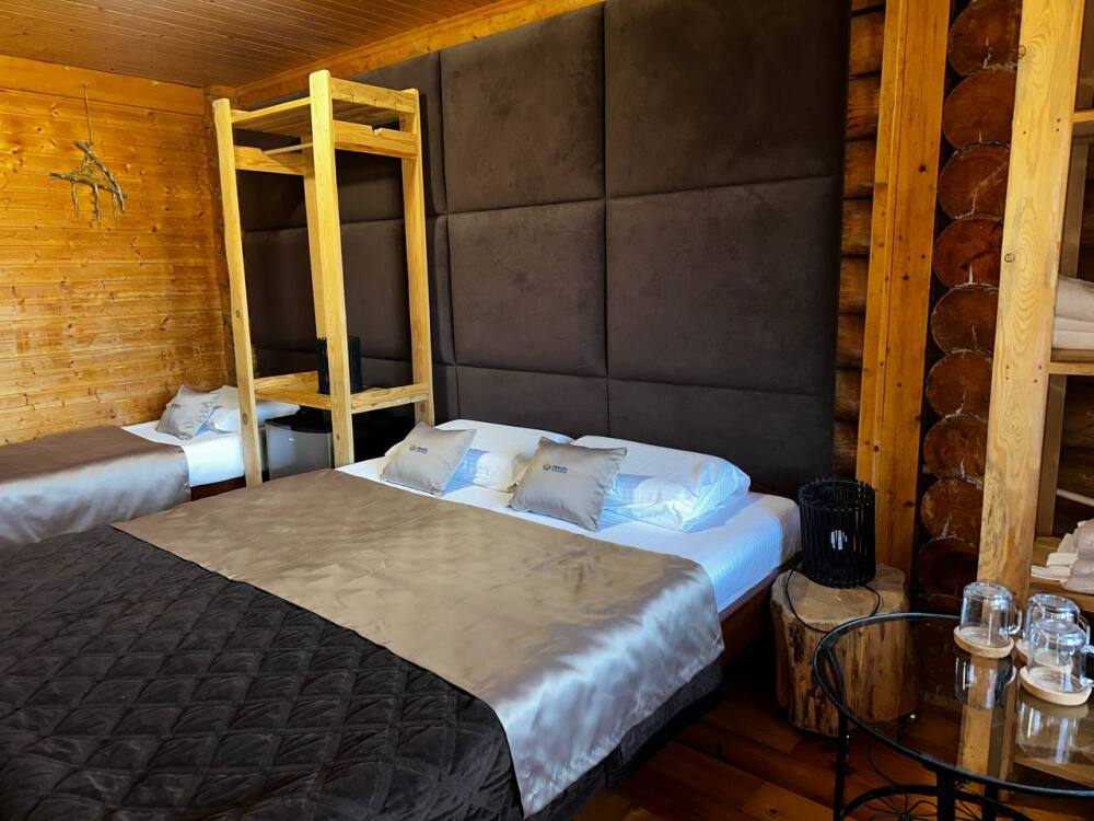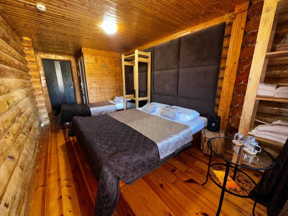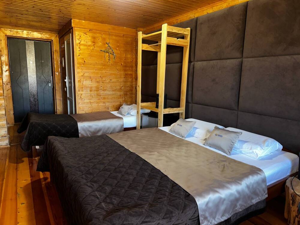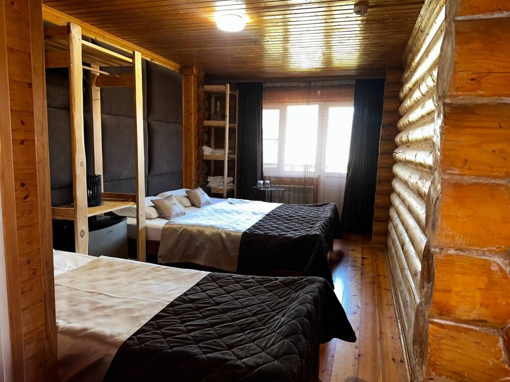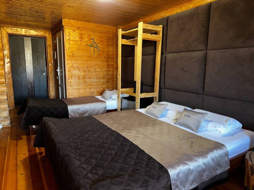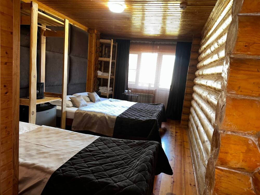 Уютные трёхместные номера оформлены в лёгком эко‑стиле, создающем атмосферу природной гармонии и спокойствия. В номере расположены двуспальная и односпальная кровати с тёплыми одеялами и ортопедическими подушками — каждый гость чувствует себя максимально комфортно.