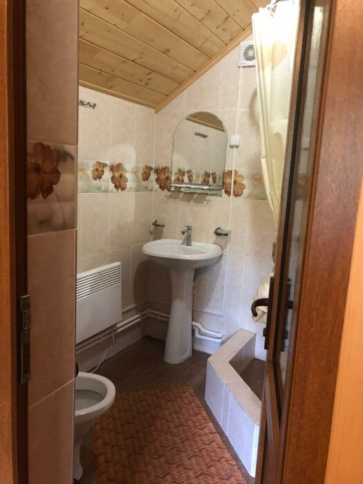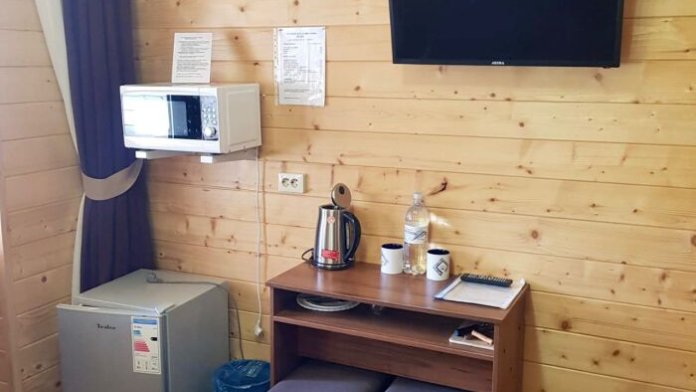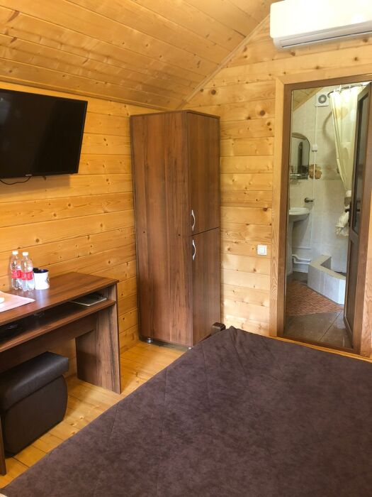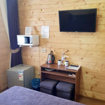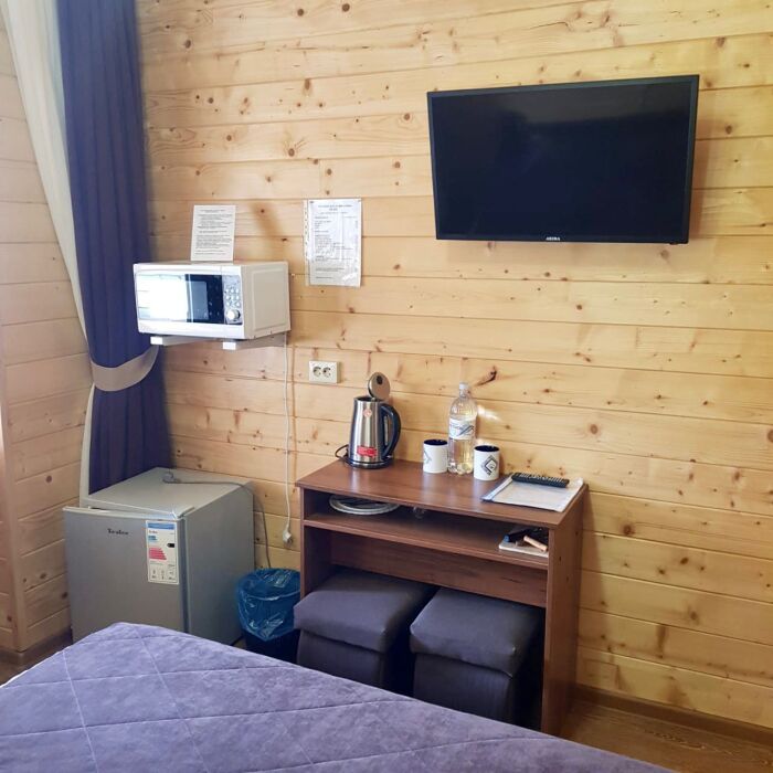 В номерах имеется: двухспальная кровать, двухспальный диван, раскладное кресло; прикроватные тумбочки, стол, стулья, шкаф, вешалки для одежды, отдельный санузел (душ, раковина, унитаз, фен, шампунь, мыло, гель для душа), сушилка для белья, кондиционер, СВЧ, чайник, посуда, холодильник, телевизор, балкон со столом и лавкой. Вид на реку и горы.