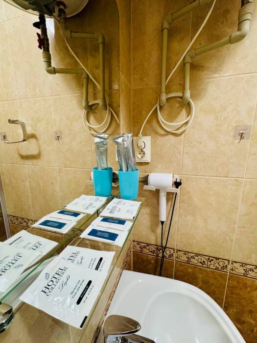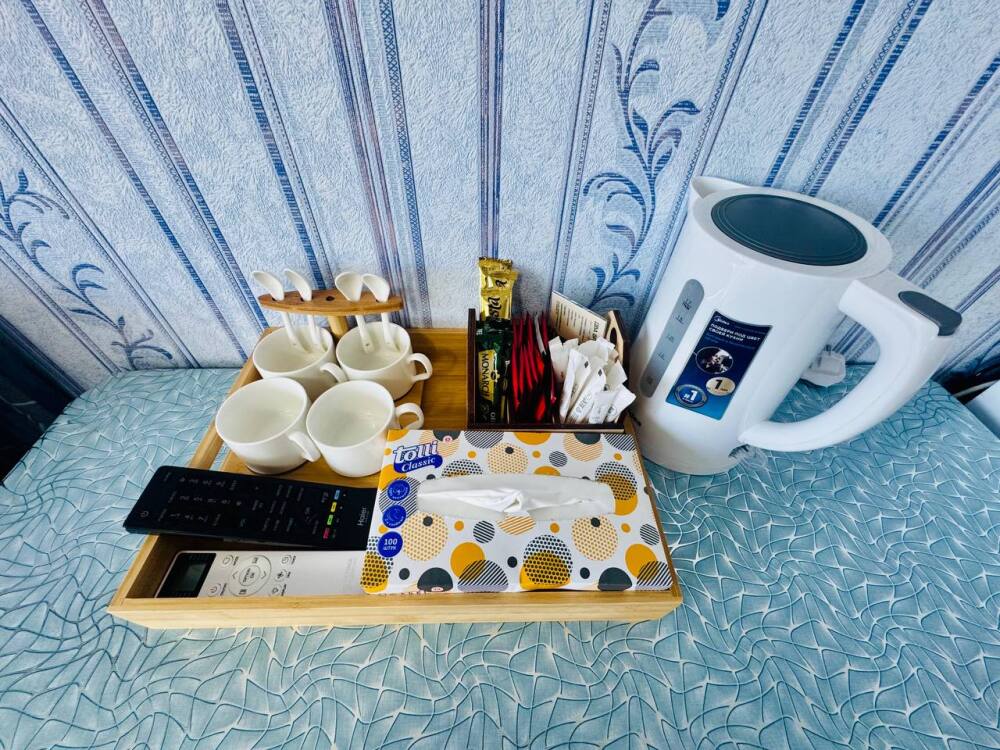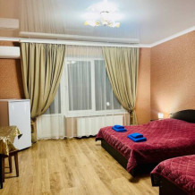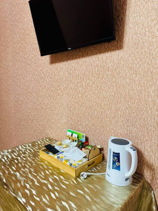 * Каждый номер оснащён удобной мебелью, холодильником, кондиционером, чайником, набором чая и кофе, а также печеньем с пожеланиями. Санузел в каждом номере включает принадлежностями для душа и феном.