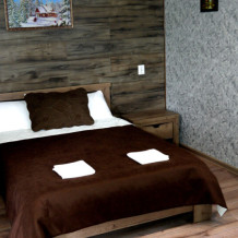 Номер люкс с видом на горы и террасой. Номер из двух комнат. В одной комнате двухспальная кровать, односпальная кровать. Во второй две односпальные кровати. Телевизор, холодильник, интернет, санузел. Бесплатная парковка, мангал на территории.