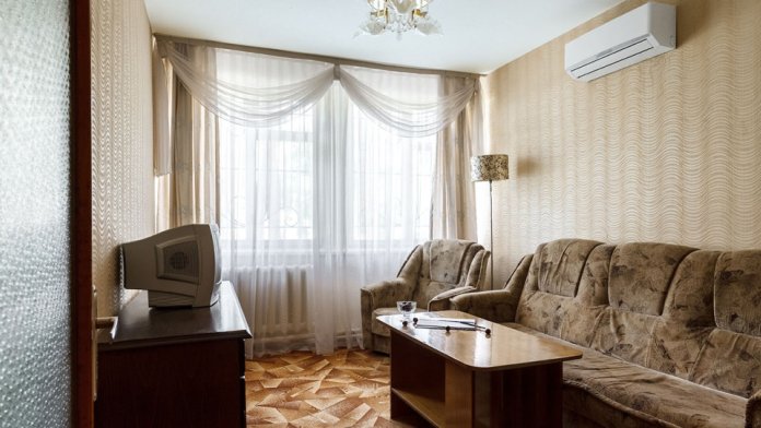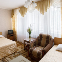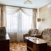 Просторные 2-комнатные номера с удобствами. В спальне две раздельные односпальные кровати, в гостиной диван и кресло, шкаф, тумбочки, стол, стулья, телевизор, холодильник, сплит-система, постельное белье, полотенца, посуда, туалет, душ/ванна.
