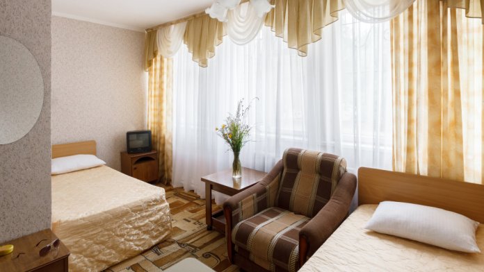 В номере: две односпальные кровати, шкаф, тумбочки, стол, стулья, телевизор, холодильник, сплит-система, постельное белье, полотенца, посуда.