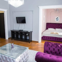 Комфорт номера создает дизайн в стиле неоклассики, представленном в розовых, белых и сливовых цветах, красивая и со вкусом подобранная мебель.