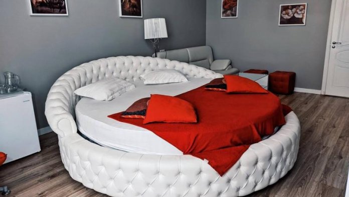 Номер категории Люкс - это просторный номер с большой, круглой двуспальной кроватью и двумя спальными местами на диване, гостиной зоной, с диваном, двумя пуфиками и журнальным столиком, зоной ТВ, гардеробным шкафом и собственной ванной комнатой с джакузи.