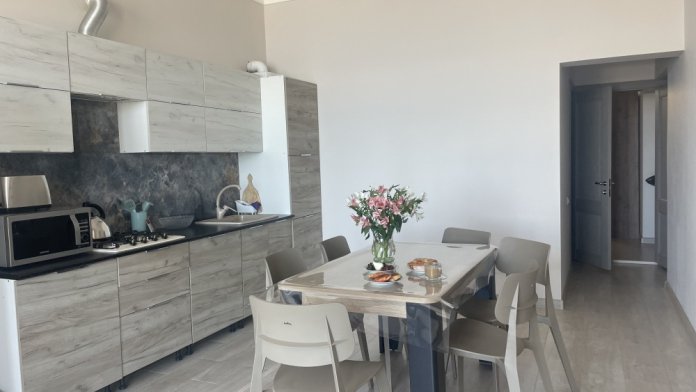 Уютная квартира с видом на море и общей террасой. На кухне есть все необходимое для приготовления еды.