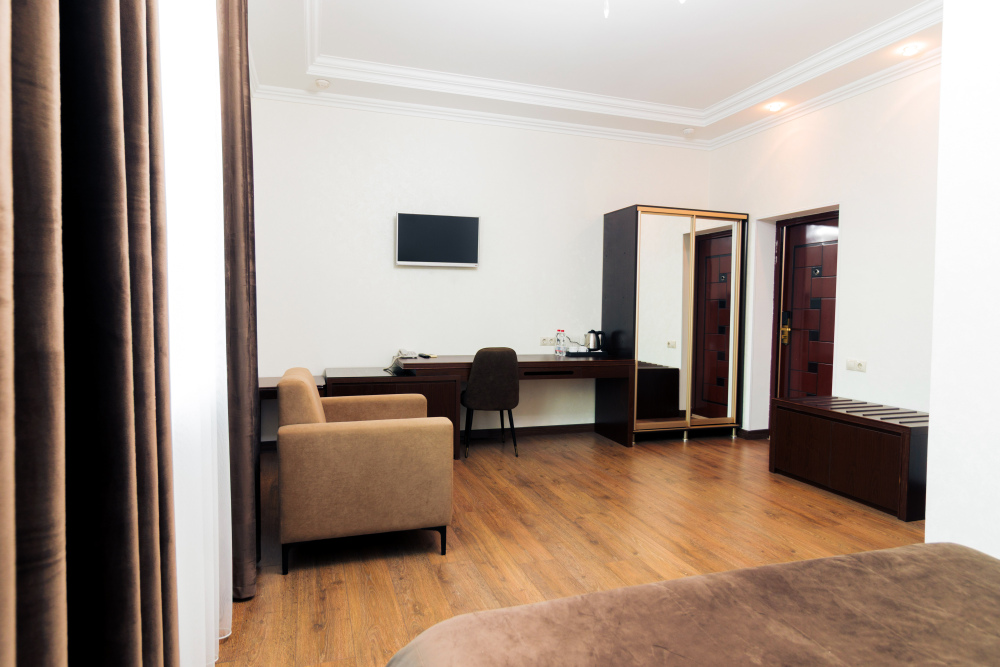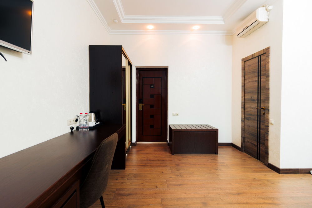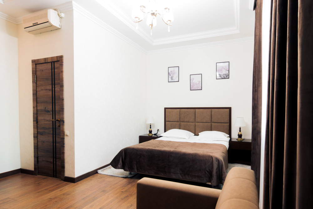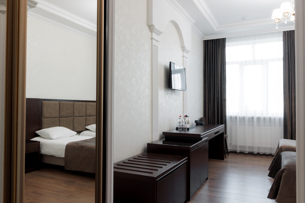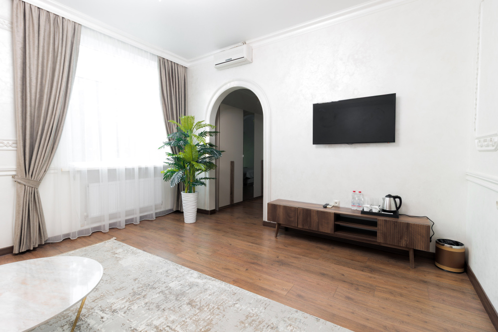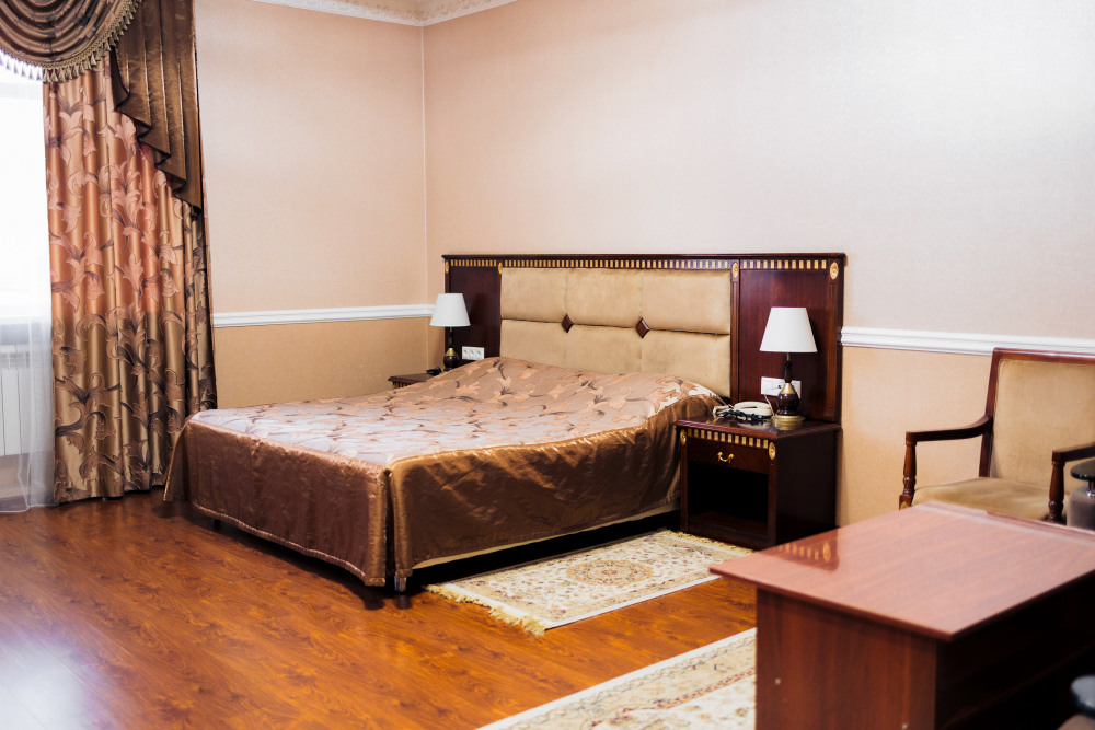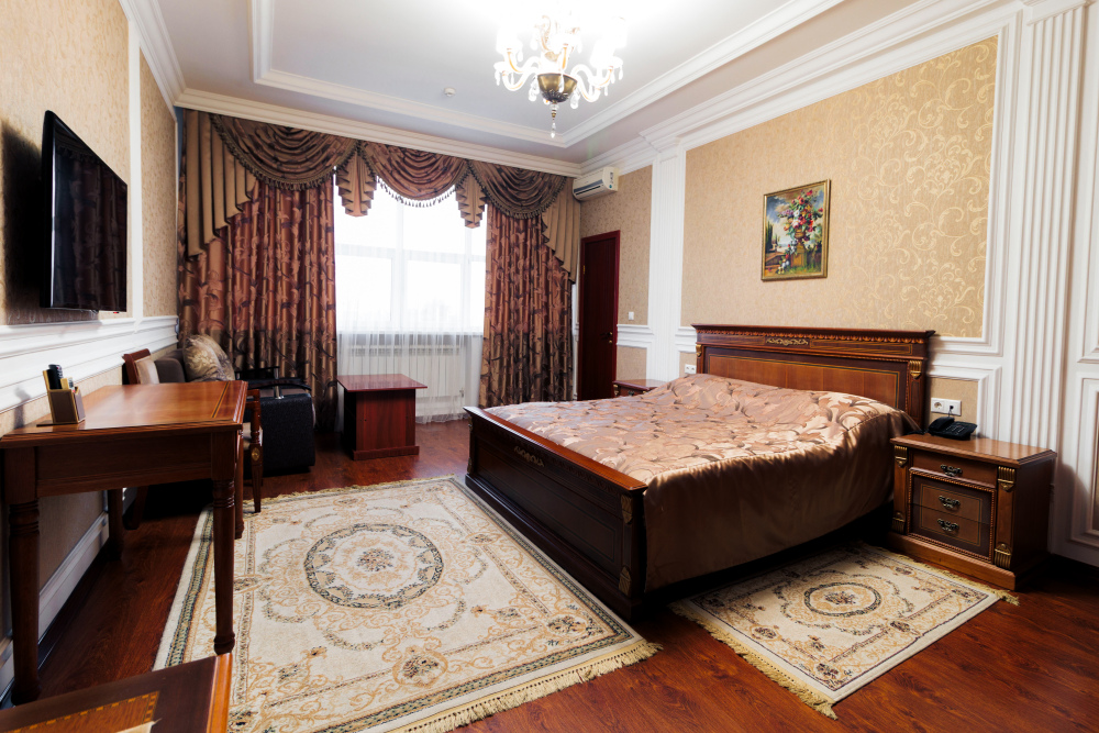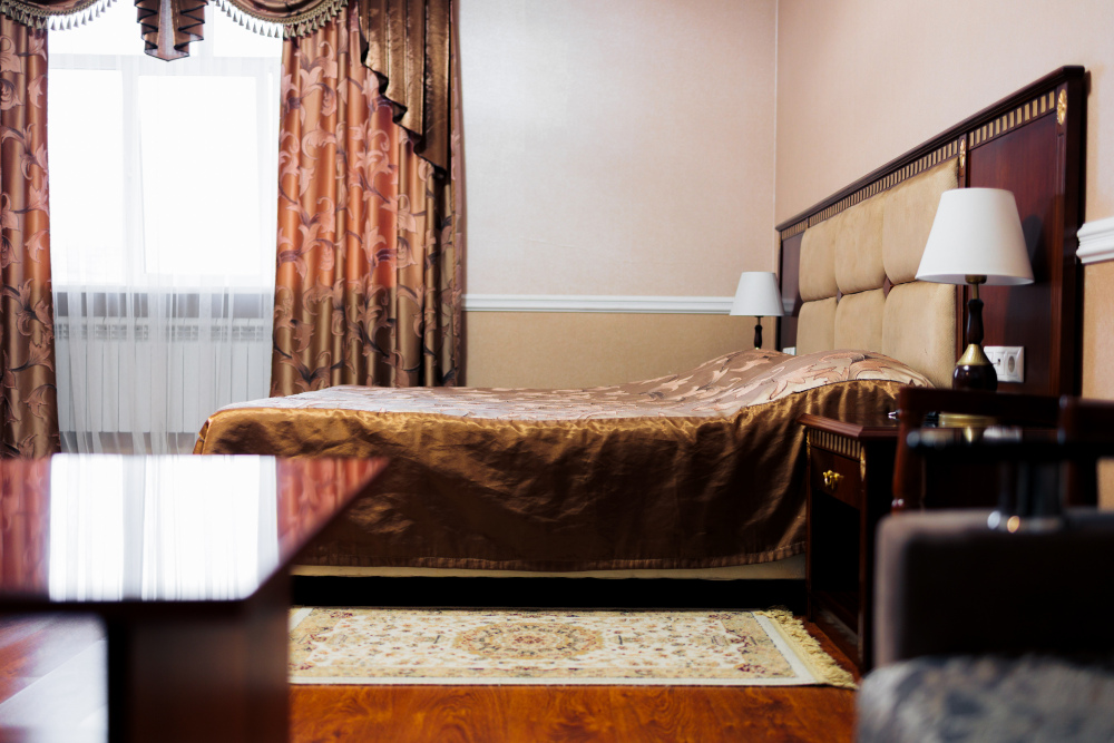 Максимальный уровень комфорта в гостинице. Две отдельные комнаты: спальня и гостиная. Подходит для длительного проживания, деловых гостей высокого уровня, семейных туристов. Пространство, приватность, удобство для работы и отдыха. Номер, в котором можно спокойно жить и принимать гостей.